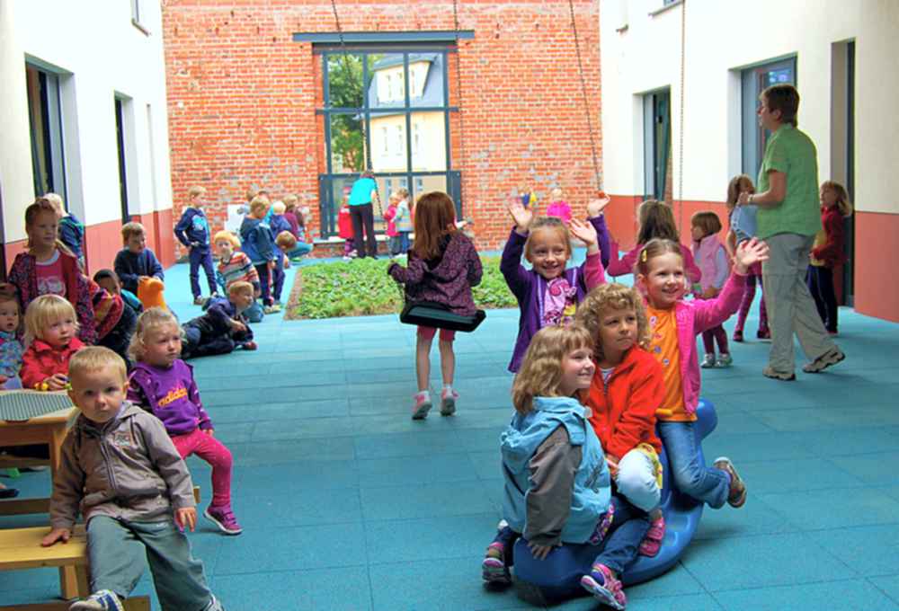 Die Kita wurde unter strenger Einhaltung denkmalschutzrechtlicher Bestimmungen in eine ehemalige Produktionshalle der „Alten Baumwolle“ errichtet. Mit über 360 Plätzen ist sie eine der größten Kindertagesstätten in Sachsen.
