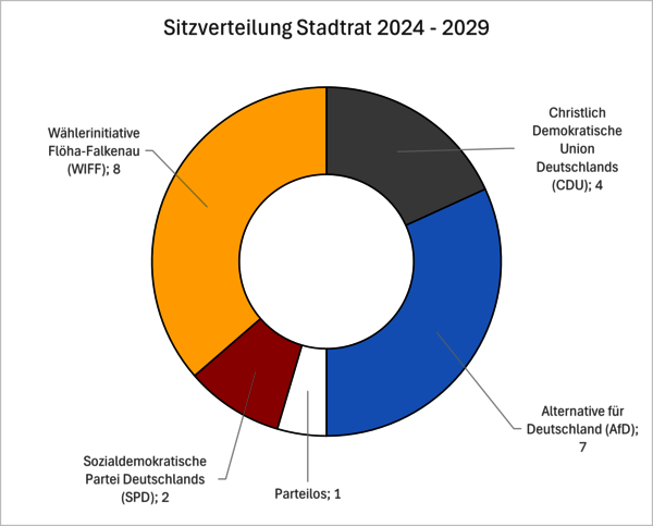 Der Stadtrat Flöha setzt sich aus fünf Fraktionen mit 22 Stadträtinnen und Stadträten sowie dem Oberbürgermeister zusammen. Zwischen den Stadtratssitzungen tagen der Technische- und der Verwaltungsausschuss.